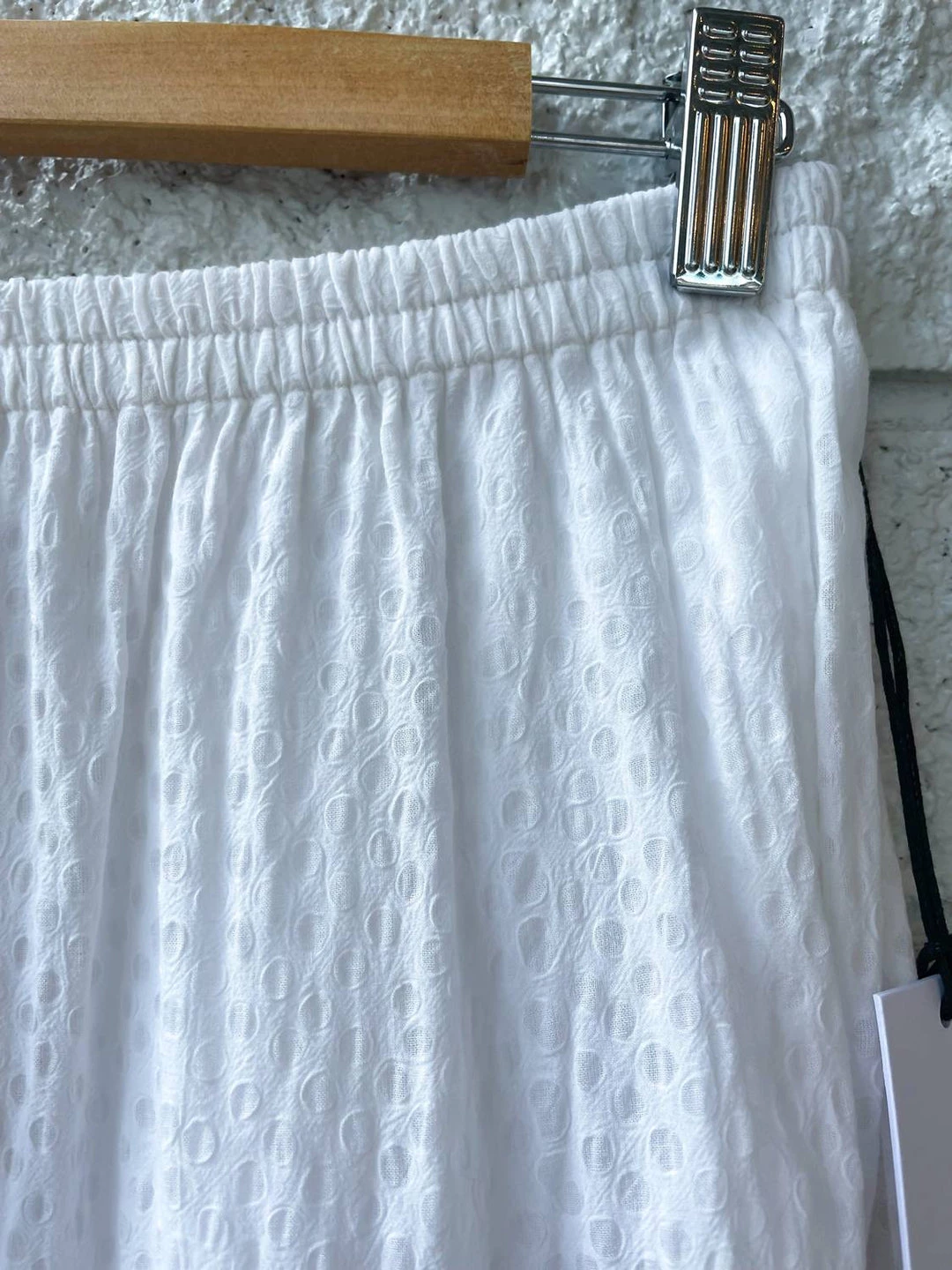 Maxi skirt has an elastic waistband and a long slit on the right side. It is slightly sheer with a lining on the inside.Dry clean recommended, or machine wash cold on gentle cycle and lay flat to air dry