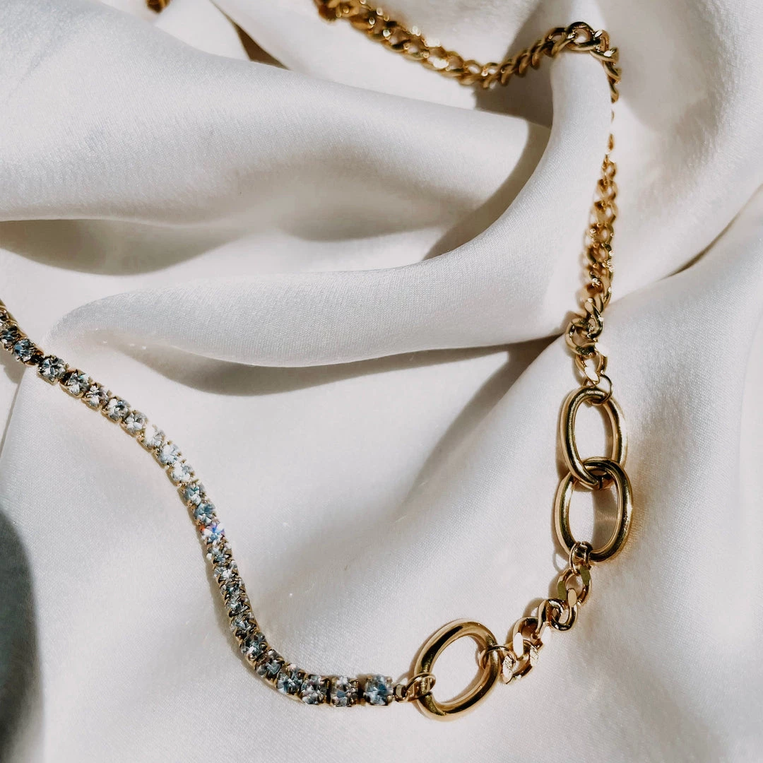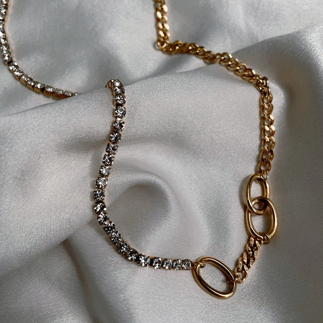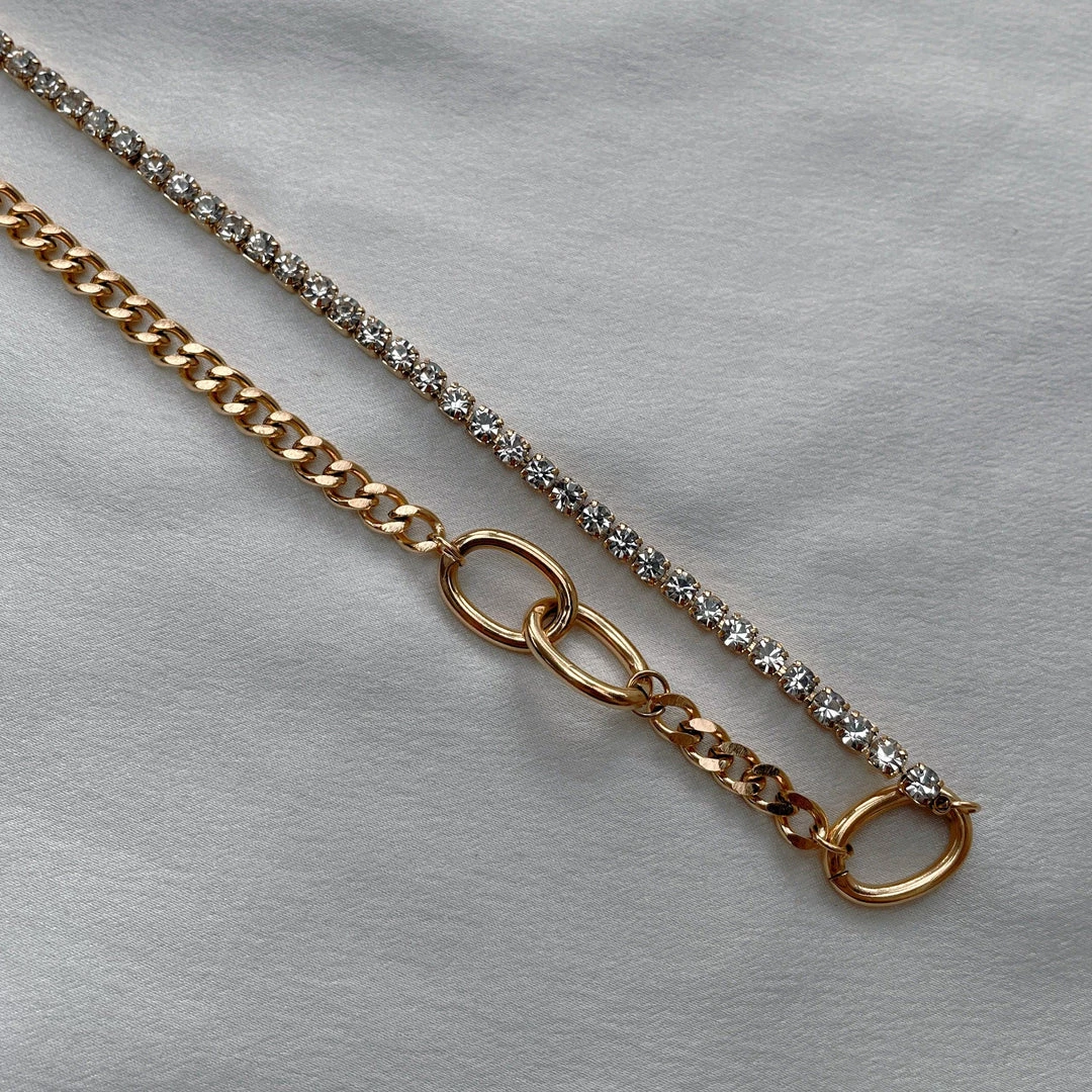 This gorgeous necklace features 2 chains, a cubic zirconia tennis necklace chain and a gold cuban chain with ring links. Wear along for an elegant minimalistic look, or layer with our other chains for more oomph.Β